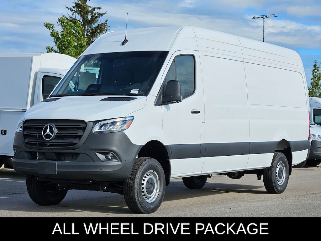 This 2025 Mercedes-Benz Sprinter 2500 comes with following features: All Wheel Drive Package, 16" x 6.5J Steel Wheels, 3.923 Axle Ratio, 4-Wheel Disc Brakes, 5 Speakers, ABS brakes, Air Conditioning, AM/FM radio, Armrest for Driver's Seat, Armrest for Front Passenger's Seat, Bodyside moldings, Brake assist, Co-Driver Thorax-Pelvis Sidebag, Driver door bin, Driver's Seat Mounted Armrest, Driver's Seat Occupancy Sensor, Dual front impact airbags, Dual front side impact airbags, Electronic Stability Control, Emergency communication system, Exterior Parking Camera Rear, Front anti-roll bar, Front Bucket Seats, Front Passenger Airbag, Front wheel independent suspension, Fully automatic headlights, Heated door mirrors, Heated Driver's Seat, Heated front seats, Illuminated entry, Low tire pressure warning, Maturin Fabric Upholstery, No Factory Installed Flooring, Outside temperature display, Overhead airbag, Overhead console, Passenger door bin, Passenger seat mounted armrest, Power door mirrors, Power steering, Power windows, Radio: Standard, Rain sensing wipers, Remote keyless entry, Speed control, Speed-sensing steering, Standard Driver Seat, Standard Front Passenger Seat, Steering wheel mounted audio controls, Tachometer, Tilt steering wheel, Traction control, and Variably intermittent wipers.
